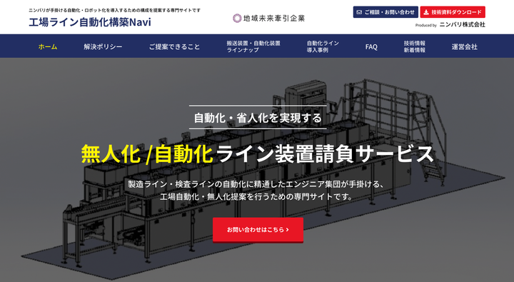 京都府福知山市にて、工場ラインの自動化ロボットの製造を行なっているニンバリ株式会社様のソリューションメディアの制作を担当しました。大手Webコンサル会社と協力してWebディレクション、デザイン、実装までワンストップで担当しました。