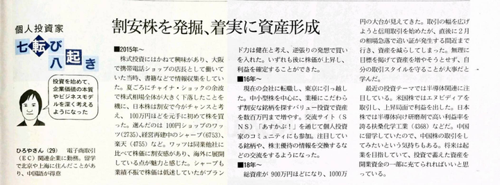 ベンチャー証券会社ストリーム広報担当の古川さんより取材の依頼を頂き、日経新聞記者の齋藤さんをご紹介いただきました。 私の経歴から株取引のきっかけ、これからの取引への志など新聞記事へ掲載頂きました。 誠にありがとうございました。
