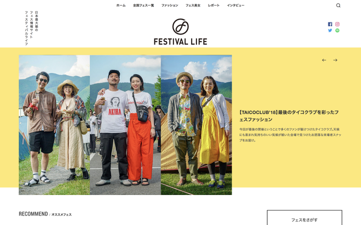 Festival Lifeを再びリニューアル。ロゴデザインディレクション、ウェブサイトデザインを担当。全国のフェスリストや個別のフェスページを追加し、フェス情報サイトとしてより強化されました。