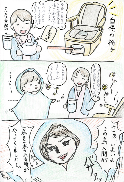 埼玉にある「おうちエステ・よもぎ蒸しサロンマシュマロウ」のご依頼で作成したよもぎ蒸し体験レポ。 ユーモアあるイラストの作成が得意です。