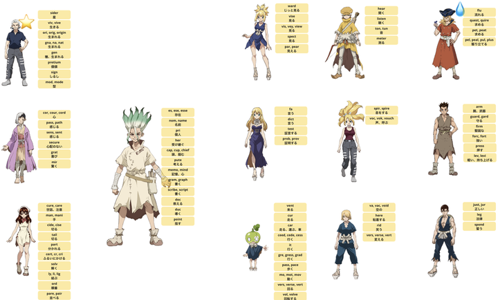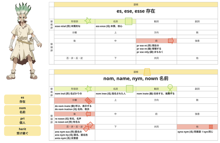 娘のために作成したオリジナル教材。 英単語の暗記を ・接頭辞、語根、接尾辞に分解 ・人気アニメのキャラクターの属性と結びつけ ・俯瞰 という工夫により効果的に進められるよう設計。
