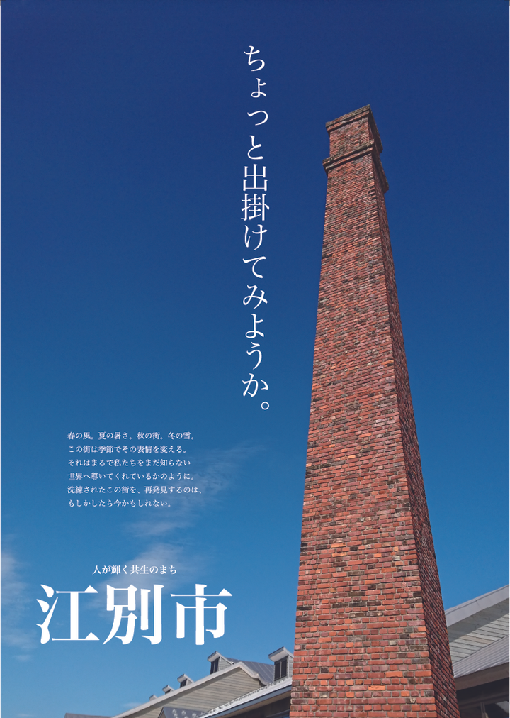 ポスターコンテストに応募するため、あっっっつい昼間に自転車で江別を駆け巡ったところ、野幌駅近郊のアンテナショップ、ËBRIのレンガの煙突を見つけました。天気も良かったので、写真を撮ってポスターにしました。おかげで奨励賞を受賞できました。