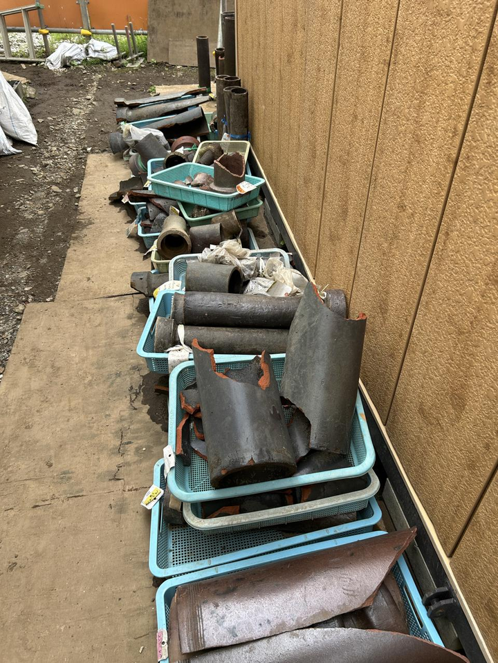 工事現場の区間をお借りして、昭和初期の建物の跡地を発掘し、そこから出土した焼き物、配管、壺、瓶等を洗浄しました。 洗浄する際は水を溜めたバケツと専用のブラシを使います。 洗う時のコツは、ブラシの毛先を細かく叩きつけるように洗浄すると、泥や砂の汚れが落ちます。