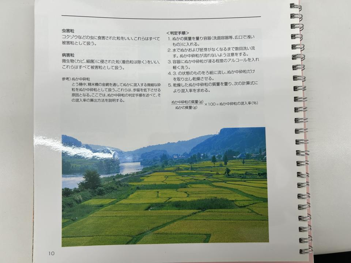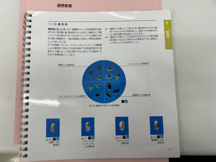 品質管理室での業務を行う上で、お米の知識を習得する必要があったため、お米のテキストをお借りし、衝撃によって砕けてしまった「細米」、害虫による「着色粒」を見分ける方法などを学ぶことができました。