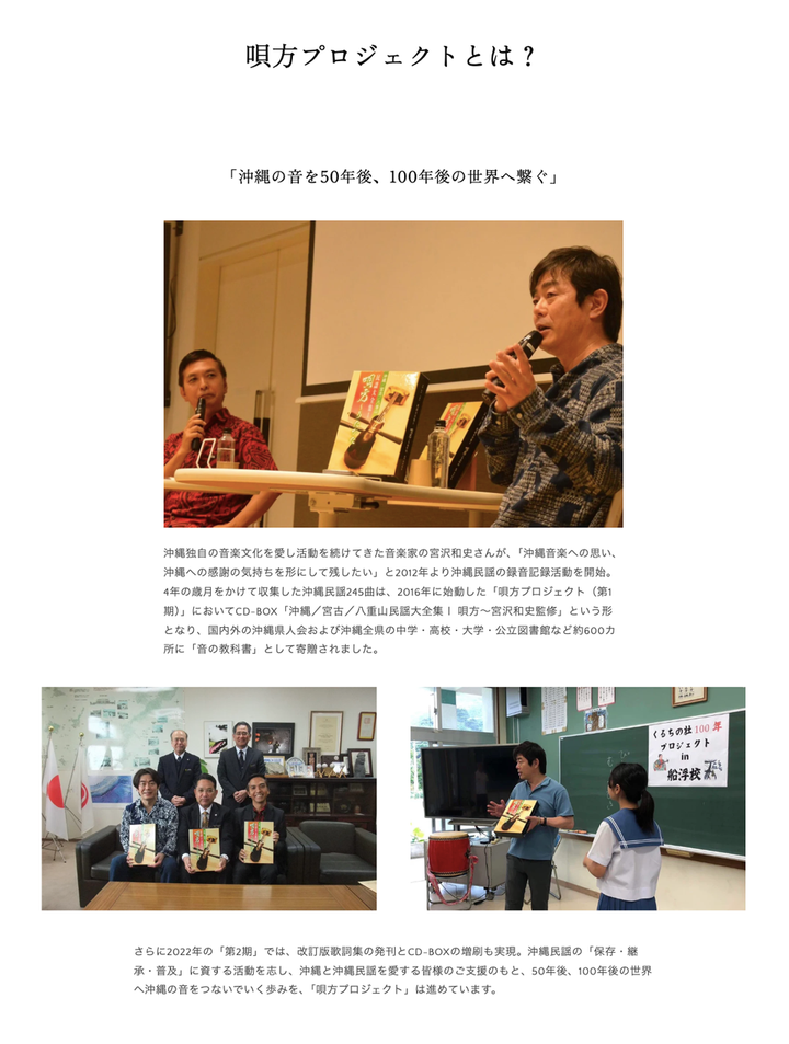 沖縄民謡保存プロジェクト公式HPの構築 URL:https://utakataproject.jp/ | クライアント:唄方プロジェクト 様 制作期間:2024/6 〜 2024/8 言語・ツール:HTML / CSS / Liquid / figma 依頼内容:「島唄」で知られるTHE BOOMの宮沢和史さんが手がけるプロジェクトの公式HPをShopifyのテーマをベースに構築。クラウドファンディングも開始するため、LPを制作する。 制作のポイント ⒈ なぜShopifyで構築したか クラウドファンディング実施を前提としたプロジェクトだったため、返礼品の送付に必要な支援者情報の管理が重要でした。Shopifyは顧客管理機能が充実しており、返礼品の発送やお礼メールの対応を効率化できる点が大きな利点です。また、Shopifyの決済サービスを利用しないプランを選択することで、必要な機能を維持しながらランニングコストを抑えることも可能でした。これらの理由から、Shopifyをベースとしたサイト構築を提案しました。 ⒉ ペルソナの設定 65歳女性 沖縄県で生まれ育つ、幼い頃から沖縄民謡が身近にあった 「島唄」をきっかけにTHE BOOMのファンになる 宮沢和史氏の活動に賛同している ⒊ デザインと構成の意図 クライアントから「プロジェクトの想いがまっすぐ伝わるサイトにしたい」というご要望がありました。 ヒアリングをもとにペルソナを65歳の女性に設定し、実際の支援者層も高めであることから、Webサイトを頻繁に利用しない可能性も考慮しました。そのため、構成はシンプルで分かりやすく、直感的に操作できる設計に。アニメーションや装飾は最小限に抑え、内容がストレートに届くことを重視しました。