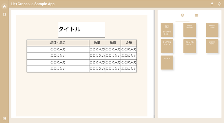 去年から注目しているLItと相性が良さそうなライブラリとしてGrapesJsを見つけて、連携させ方を学ぶために作ったwebアプリです。右上のダウンロードアイコンをクリックするとそれまでに作ったHTMLがPDFとしてダウンロードできます。
