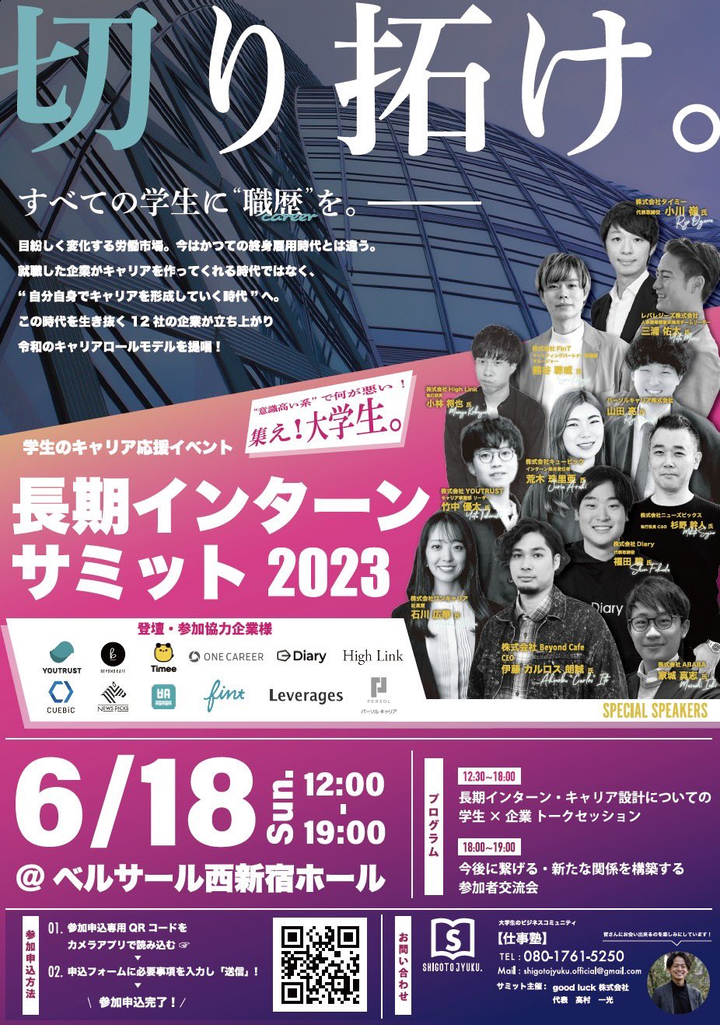 現在法人3期目。長期インターン生として70名以上の大学生が働いています。 日本一の若手キャリアオーナーシップ推進企業を目指しています。 ネガティブな配属ガチャやミスマッチによる早期離職をいかに減らせるかを考えています。