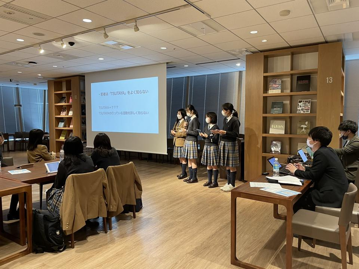 渋谷TSUTAYAを時代の変化に合わせてどのようにリニューアルするべきか、高校生目線で考える特別講座に参加。 実際に渋谷TSUTAYAを利用した上で8階から地下2階までの内装案を考え、CCC(カルチュア・コンビニエンス・クラブ株式会社の取締役や社員の皆さんにプレゼンを行った。