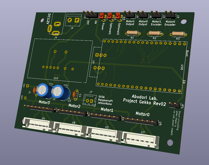 学習用自律移動ロボット"Lapin"のモータ駆動用のモータドライバ。ROS2と通信し、twistを投げると、実際の駆動量とオドメトリ を返す。オプショナルでIMUの値も出力できる(選択制)。最大4出力でき、メカナムホイールやオムニホイールロボットに対応可能。 電源は6~12V入力でDCジャックまたはターミナルで接続し任意のバッテリーやACアダプタを使用できる。次バージョンで突入電流を回避させる回路を入れ市販のモバイルバッテリーの保護機能で停止しないモデルを作成中。 5V3Aの供給能力もあり、バッテリーからGekko一つでRaspberryPiやJetsonNanoを駆動することが可能。マイコン はESP32DevKitがそのまま流用でき、ROS連携させるのもよし、単体でIoTモータ制御に使用してもよし。 初めてハンダ付けしてモータを回してもらうため、表面実装部品は使用せず、間隔もゆとりのあるものとした。何人かはんだ に慣れていない人にテスト実装してもらったが、難なくモータを回すところまでこなすことができ、実績あり。