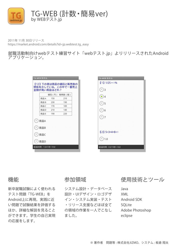 採用試験で使われる「TG-WEB」の練習ができるAndroidアプリです。合同会社テズモックスよりリリースされました。