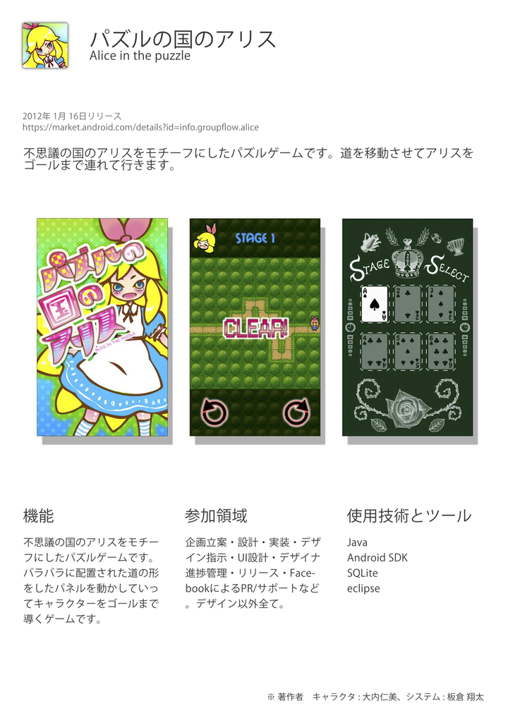 SurfaceViewを利用したAndroid用ゲームアプリです。画像の制作を依頼し、それ以外を全て一人で設計・実装しました。「DIGITAL FRONTIER GRAND PRIX 2012」で「ベストプログラミング賞」 を受賞しました。