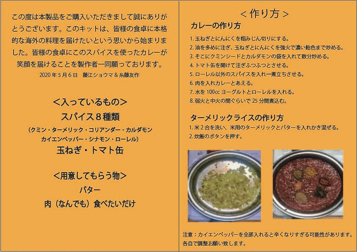 代表として、全体を統括しながらメンバーの長所を最大限活かせるような環境づくりをしました。コロナによって、海外に行けない中で自宅で海外を体験できるようなサービスとして、自宅で作れる海外スパイスカレーのミールキット を開発しました。300食以上を販売しました。