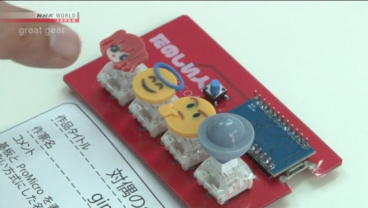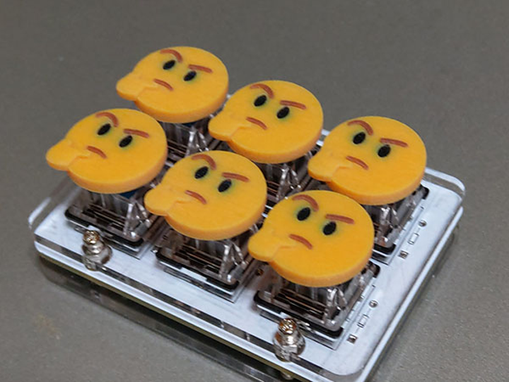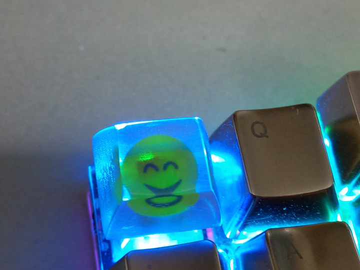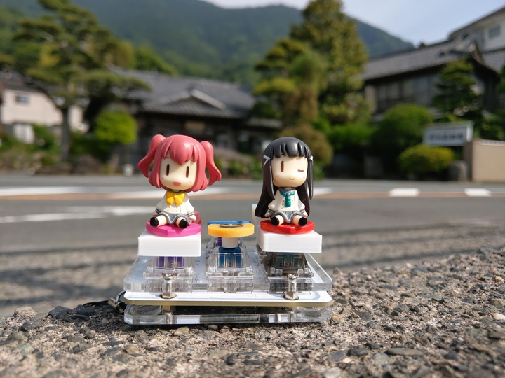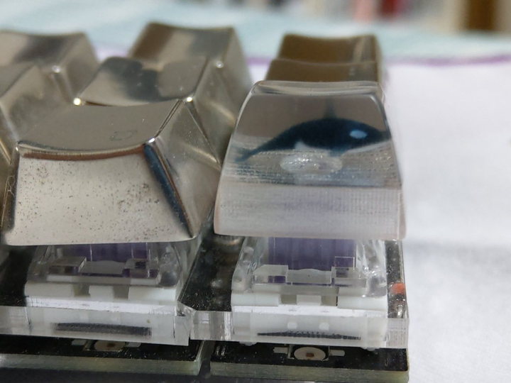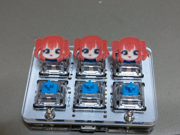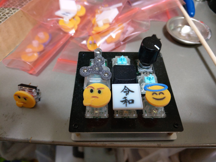 3Dプリンターによる自作キーキャップです。 最後の1枚は3Dプリンタで突起付きの台を作り、好きなフィギュアを差し込めるようにしたものです。