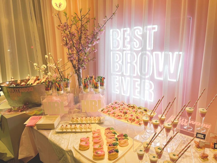 JULIA IVYでは月次で全社カンファレンスを実施しています。 月次報告では前月の数値・活動報告などを発表を行っております。 報告会の後は社員全員でお酒を飲みながら軽食を食べ、普段は各部署がそれぞれのスケジュールで動いており社員全員が一同に集まれる機会も少ない為、この月に一度のカンファレンスの時間は貴重な時間となっております! 写真はその第一回目のカンファレンスの様子です。 4月という事で「お花見」をテーマに装飾・ケータリングを準備致しました🌸 HBLのカラーでもあるピンクをあしらい、社員がワクワク感動する空間が完成しました。