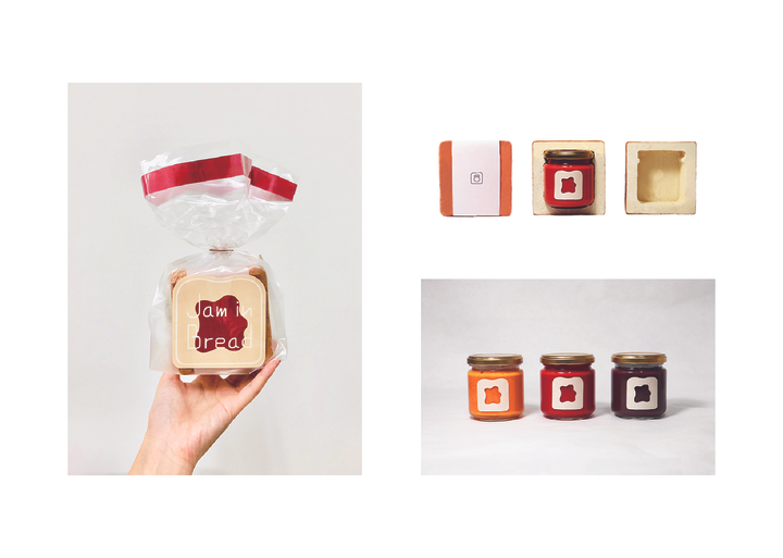 ASPaC 2019(日本・アジア学生パッケージデザインコンペティション)一次選考通過作品。募集テーマであるインスパイア(INSPIRE)をもとに食パンのような緩衝材に入ったジャム瓶のパッケージを制作した。「ふわふわの食パンに好きなジャムを塗った朝の食卓」 のような、いつもの小さな幸せをジャムのパッケージから味わってもらいたいという想いがある。パッケージは紙、ビニール、ガラス、発砲ウレタンなど様々な素材を用いて制作している。