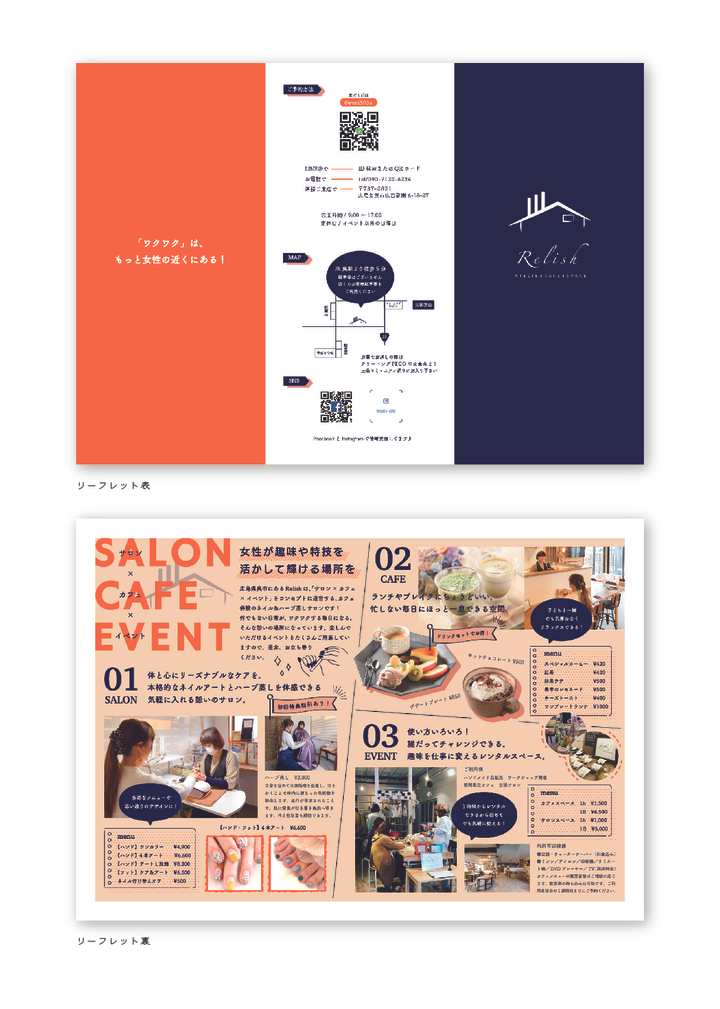 広島県呉市にオープンした、ネイル&ハーブ蒸しサロン「RELISH」のリーフレットデザイン。「サロン×カフェ×イベント」をコンセプトに、女性が趣味や特技を生かして輝ける場所を作りたいというオーナーさんの想いや施設内容を、三折りリーフレットにまとめている。 掲載する情報が比較的多かった為、雑誌風のレイアウトで飽きのこない楽しいデザインを心がけた。店内のカラーである白・茶色・紺色と、輝く女性をイメージしたオレンジを使い、「RELISH」らしいリーフレットを目指した。