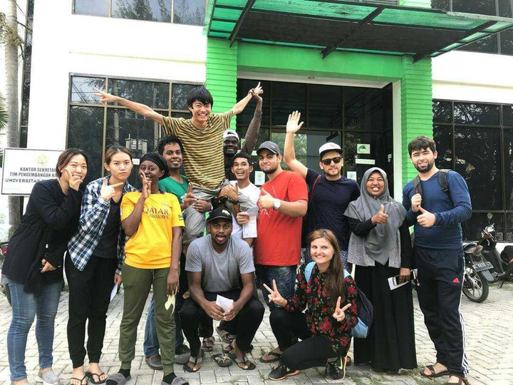 政治的に特殊なアチェにある大学に直接留学したいと問い合わせ、Darmasiswa Scholarship Programというインドネシア政府奨学金を活用して、大学史上初の日本人留学生としてインドネシア語とアチェ政治を勉強。 写真は当時の全留学生、やっぱり人類みな兄弟。