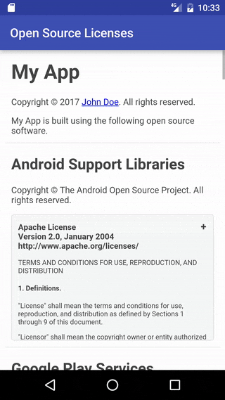 Qiita: http://qiita.com/rockwillj/items/dae2364be281c0ea2ef1 ライブラリーのライセンスをチェックしてライセンスページを生成する Gradle プラグイン。Cookpad さんの Android License Tools Plugin をフォークして作成。
