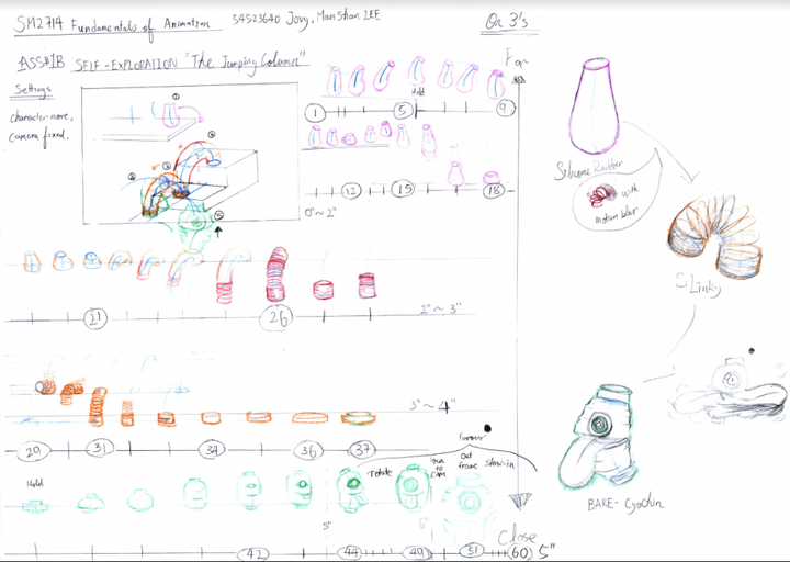【手書きアニメーション】 課題要求は一つの円柱が二回変貌する事。円柱からスリンキー、スリンキーから化け提灯。手書き60枚、時間調整なし連続再生したの作品です。