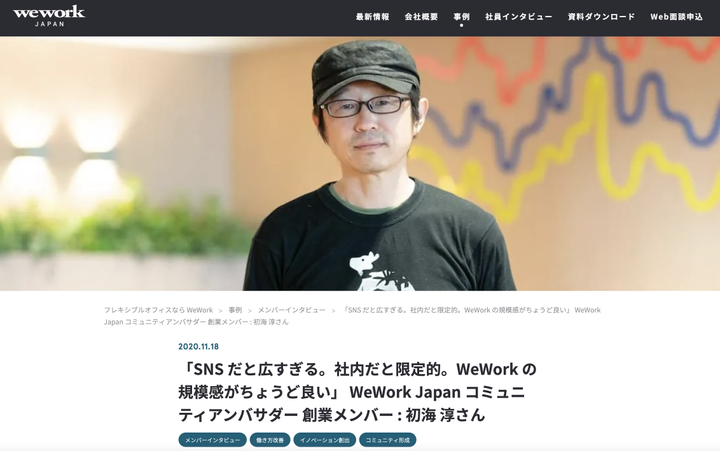 コミュニティ型ワークスペース「WeWork」のコミュニティアンバサダーとして活動。WeWork社員のコミュニティチームを、WeWork入居者がインタビューしていく「One to One」を企画、連載中。"Do What You Love"というWeWorkのスローガンを体現するコミュニティチームと入居者が一緒になって、独自のコミュニティを創り出していることを言語化するプロジェクト。