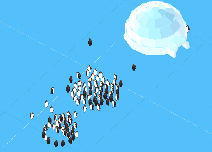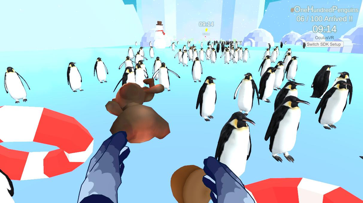 『100匹ペンギン』は ”群れと遊ぶ” ことが可能なVR作品です。 プレイヤーは身体やアイテムを使い、ペンギンたちの興味を惹きながらゴールへと導いていきます。 ペンギンたちは色々なコトに興味を示します。 進んで欲しい方向とは別の方向に進んだり、目の前のプレイヤーを無視してるようだったりと気まぐれなように思えて、実はペンギンたちにはペンギンたちなりの理由がちゃんと存在しています。 そんなペンギンたちをどの様にゴールへと連れていくか、プレイヤーは自らの身体で試行錯誤することで、自分なりのやり方を導き出していかなくてはならないのです。 思い通りに進んでくれない彼・彼女らとの やり取り=コミュニケーション を通して、VR空間ならではのインタラクション・スペースを楽しんで頂きたいと考えています。