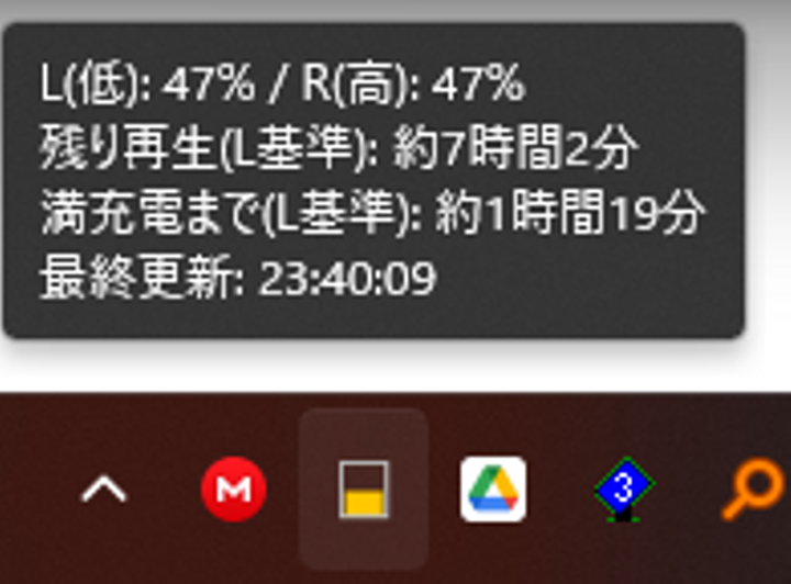Windows11において、Bluetoothデバイスのバッテリー残量の確認は手間が掛かります。 (設定画面を開いて、スクロールが必要) そのため、タスクトレイアイコンでイヤホンのバッテリー残量を確認できるスクリプトを開発いたしました。 Pythonで実装。Geminiを用いて1時間程度で開発。