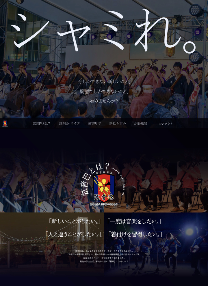私が所属している、津軽三味線サークル弦音巴(おとは)の新入生勧誘用Webサイトです。 企画からデザイン、実装までを私一人で行いました。 スマホから閲覧することを想定して制作したWebサイトですが、PCへのレスポンシブ対応も行っています。 サークルの一事業としてチームで運用しました。