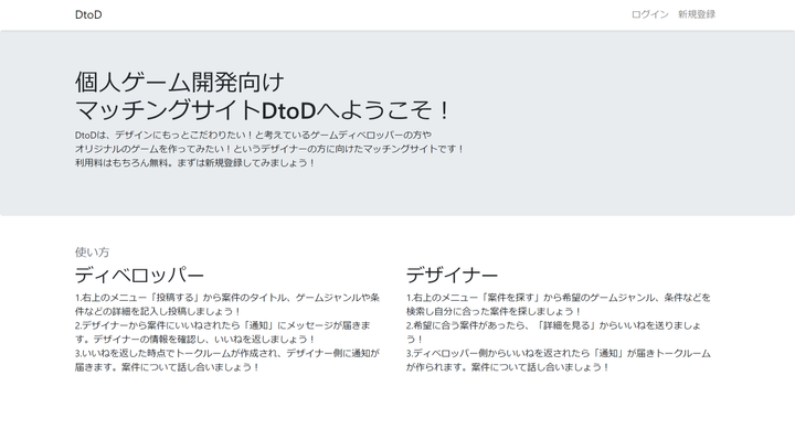 「DtoD」はゲーム開発者(プログラマー)とデザイナーのマッチングアプリです。 UIは簡素ですが、「ユーザー登録・ログイン・編集・退会」「案件の投稿」「検索」「メッセージ送受信」「いいね登録」「通知」の機能を持っています。 PHP (>= 7.0) / Laravel 6.0 / MySQL / jQuery / Bootstrap / Heroku