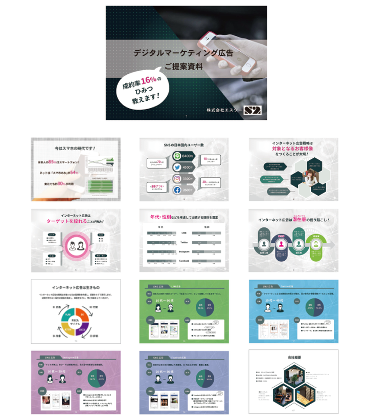 デジタルマーケティング部として、自身が営業活動に使う資料を自作しました。 打ち合わせの度にブラッシュアップをはかり、更新し続けて使ってきた営業資料です。 illustratorにて制作しています。