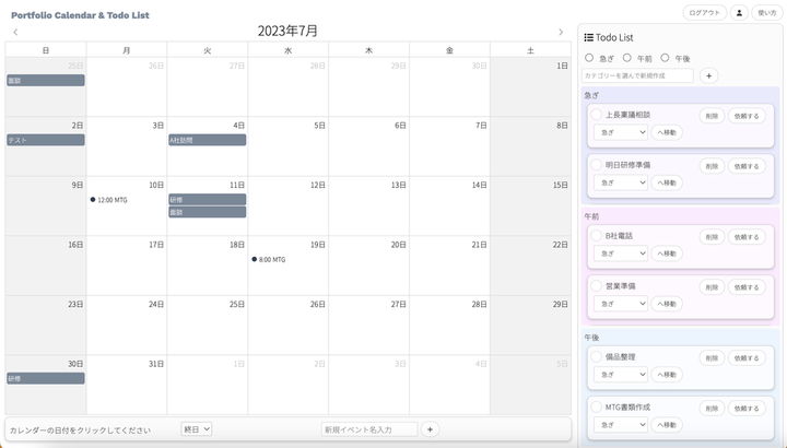 独学で学習後、カレンダーとTodoリストが使えるWebアプリを作成。 GitHubにコードを載せてます。 https://github.com/gokana-pppp/portfolio-calendar 【実際の作成工程】 要件定義、詳細設定(2週間) ↓ 開発(1ヶ月) ↓ データベース作成(1週間) ↓ デプロイ準備(1週間) ↓ デプロイ完了 【使用技術】 ・React 18.2.0 ・TypeScript 4.9.5 ・node-sass ・@emotion/react 11.11.1 ・@fullcalendar/react 6.1.7 ・@supabase/supabase-js 2.26.0 ・firebase 10.0.0 【工夫した点】 ・カレンダーのUIのみオープンソースのライブラリを使用し 全体的なデザインのCSSは自分で書いた。 ・ユーザーが使い方を見ただけで分かるように、デザインはなるべくシンプルにまとめた。 Todoリスト部分は実際の付箋を見本にした。 ・バックエンド言語は未修得だが、supabaseを用いデータベースを構築したり firebaseでデプロイまで自力で行ったところ。