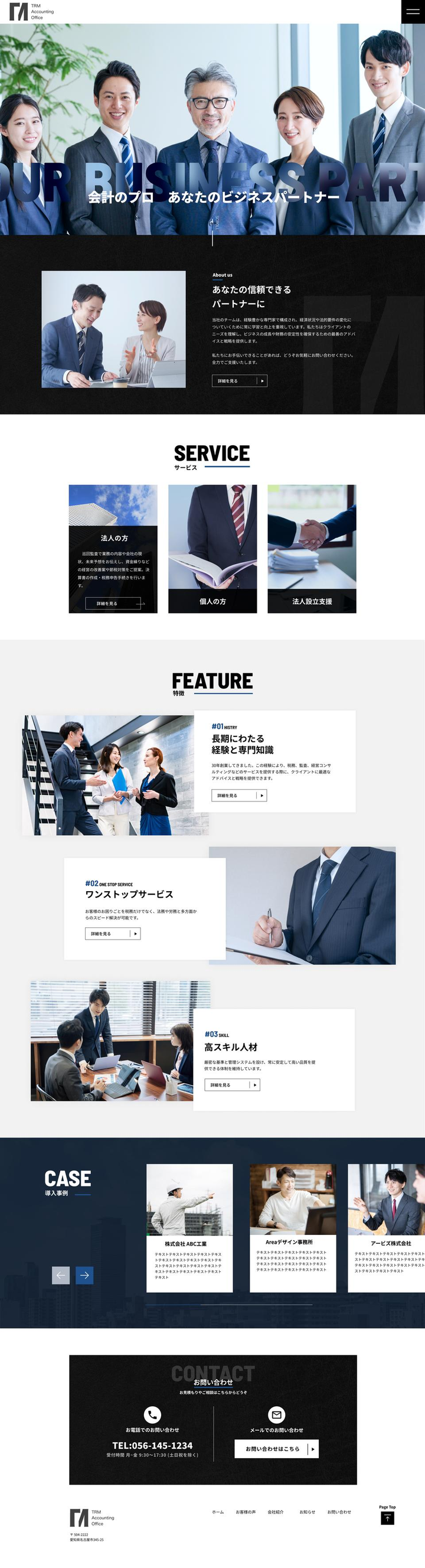 担当:WEBサイトデザイン(TOPページ) 制作日数:5日 会計事務所としての信頼感とご要望の 個性的を表現するため“ずらし”をテーマにしました。コンテンツは見やすさを重視。シンプルですが、要素をずらすことで洗練された印象を付けました。