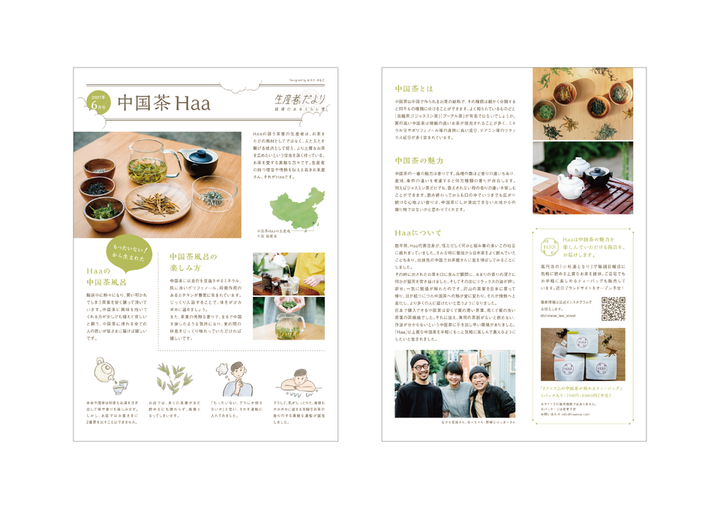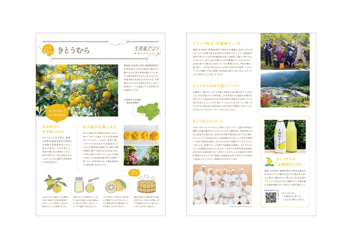 [ディレクション+デザイン+イラスト] 銭湯ぐらしの主力商品「お風呂のもと定期便」に毎月同封するフライヤーを制作。 企画段階から携わり、フォーマットを含めたデザインとイラストを担当。 お風呂のもとを提供してくださる全国の生産者さんの魅力を伝えるため、何度もメンバーと議論を重ね、生産者だよりが完成しました。 「お風呂のもと定期便」は『体と心をあたたかく。環境にやさしく。』がコンセプトのため、手作り感と安心感あるデザインに。色や余白の使い方、イラストを手書き風にするなどで、全体的に優しいトーンを心掛けました。