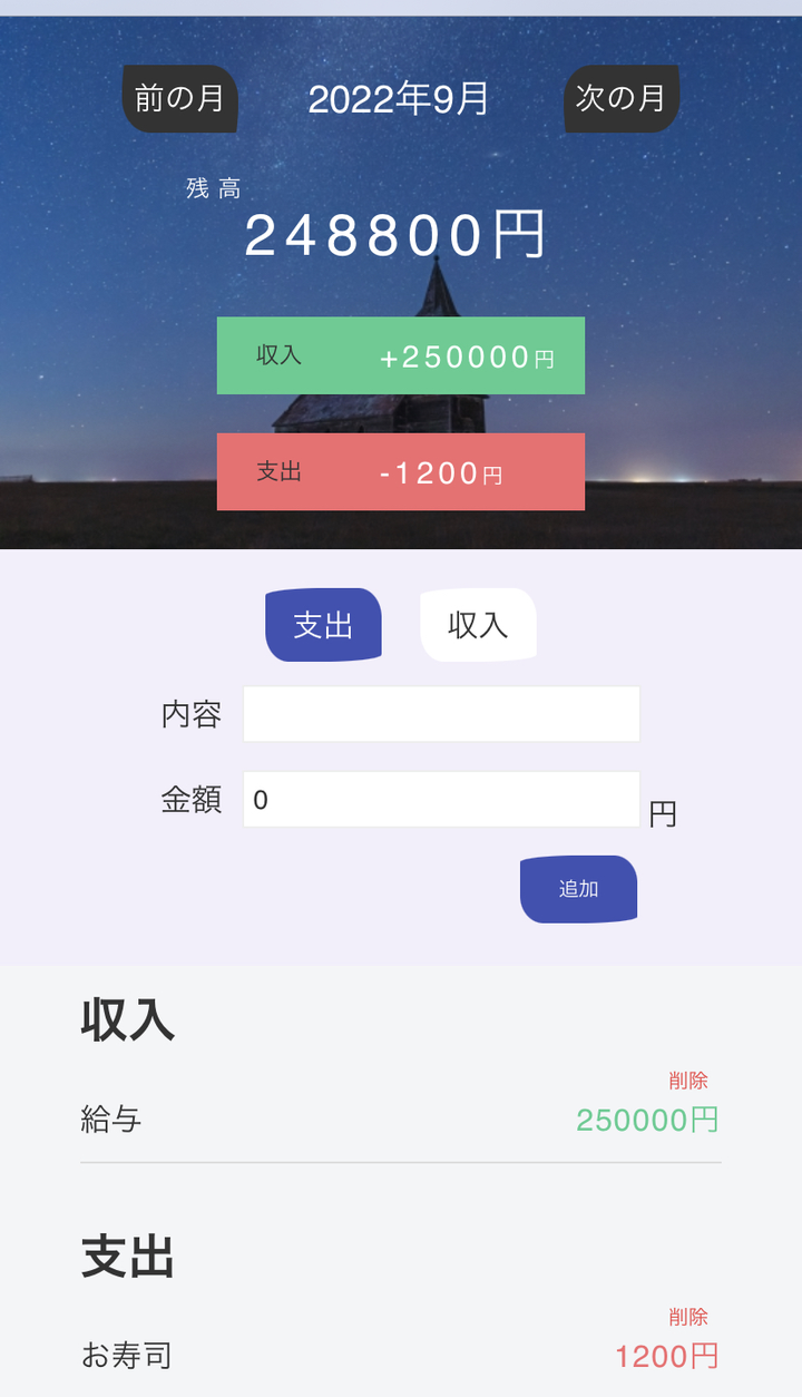 ■作成したアプリケーション 毎月の収支を記録しておけるアプリ ■ サイトリンク closeしました ■ Github フロント: https://github.com/kandalog/money-book-frontend バックエンド(API): https://github.com/kandalog/money-book-backend ■サービスの概要 ○できること ログイン・ログアウト 収入の追加 支出の追加 月ごとに支出・収入を表示 月ごとの残金を表示 ■使用技術 ○バックエンド Node Express ○フロトントエンド JavaScript React Styled-Components ■開発人数 ・個人開発(一人) ■ 開発期間・過程 2022年9月中旬~下旬 ■開発背景 Reactを学習したので何かアプリを作りたかった。 毎月のバイト代が給料日前に消えてしまうので収支を記録したかった。 既存のアプリはApple Storeにゴロゴロあるが、機能が多い。 シンプルなものが欲しかった。 ■大変だったこと 今回バックエンドにExpressを採用した。バックエンドはRails(Ruby)の経験しかなかったため、他の言語で挑戦してみたかった。フロントのJSに合わせた側面もある。 ExpressはRailsに比べて情報量が少なく、海外の記事を参照したながら手探りで作成するのが大変だった。特にSequelizeの情報が少ない。 英語の公式Docを活用した。 Railsの情報量が多いことを再認識した。