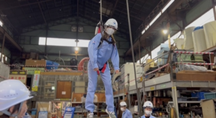 現場系の会社ではあるあるな体験ですよね。弊社では内定者懇親会で実施しています。 内定者に混じって吊ってもらった時の一枚。