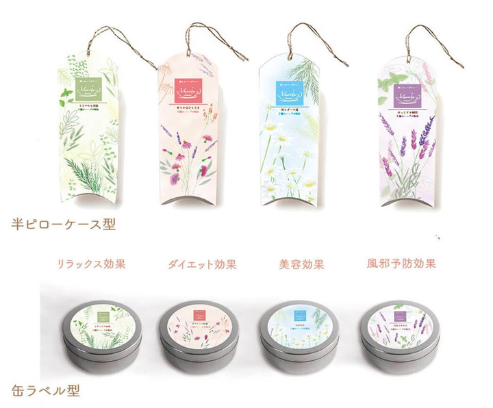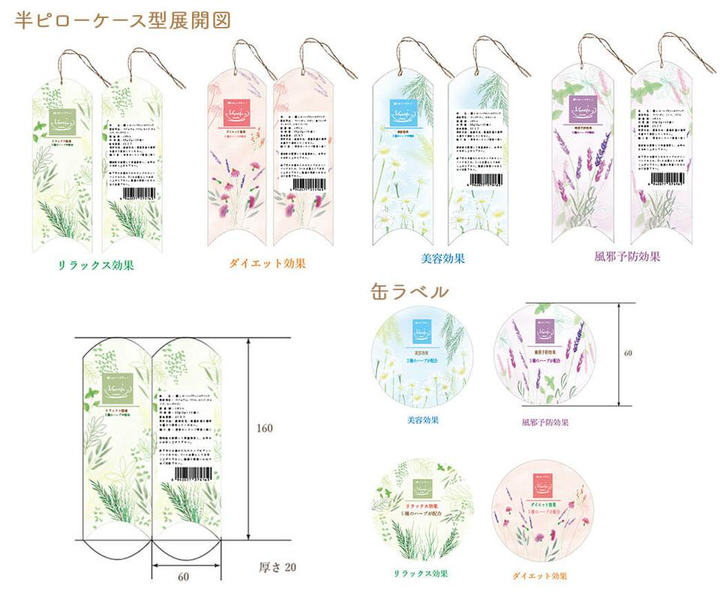 ターゲット:癒しを求める20〜40代の女性 リラックス効果、ダイエット効果、美容効果、風邪予防効果を謳う、4種類のハーブティーのパッケージをデザインしました。 パッケージは半ピローケース型と缶ラベルの2種類を制作。 ハーブの持つ効果や優しい香りが伝わるように、柔らかいタッチでイラストを描き、全体を温かみのある雰囲気に仕上げました。