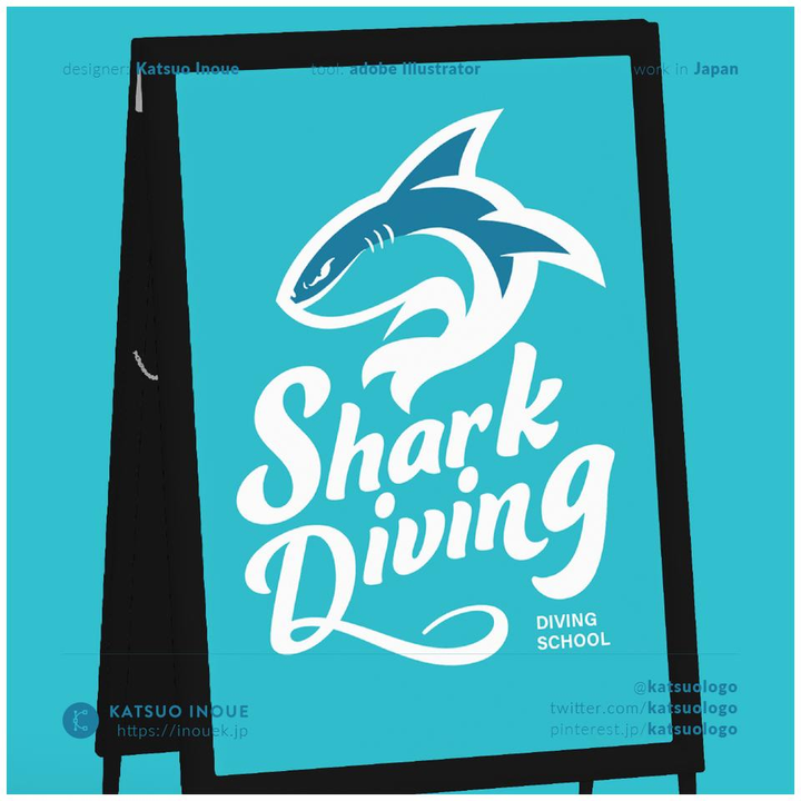 迫力のあるサメをシンボルマークとして、ダイビングを感じさせる躍動感を表現。サメはなるべく怖くならないように、かっこよく見えるように描いています。