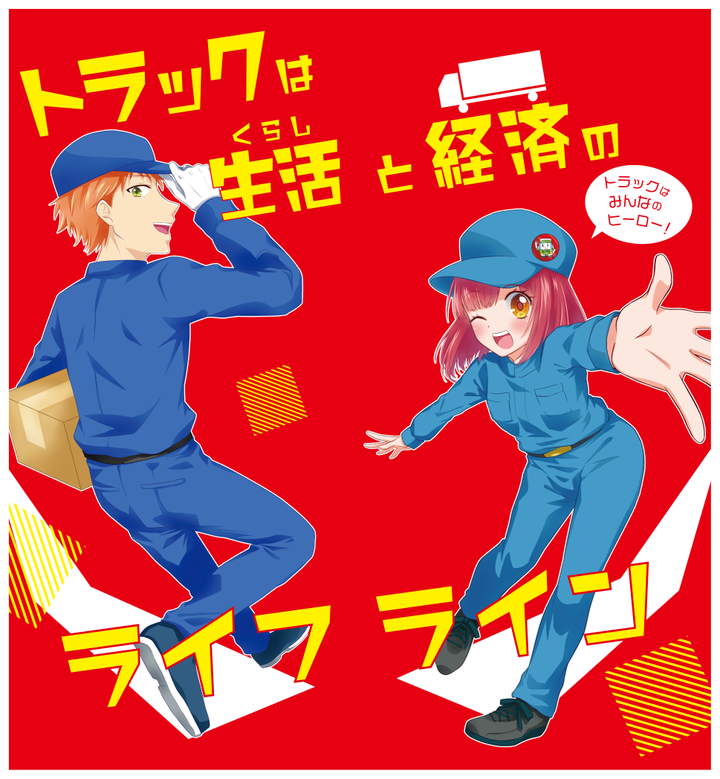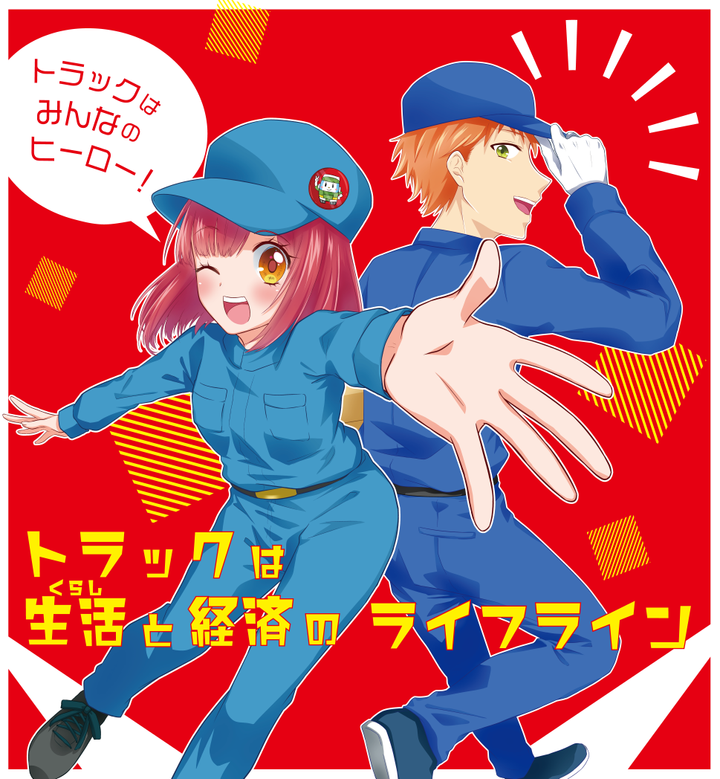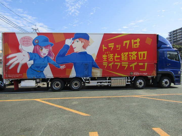 熊本県トラック協会さんのトラックの日PRラッピングデザインをさせて頂きました。 アニメ関連のイベントでのお披露目ということでアニメの絵柄を意識して描かせて頂きました。画像には実際のトラックと、側面デザイン二種、背面デザイン一種とそのボツ案を載せています。 現在熊本-鳥栖間で運行中です。