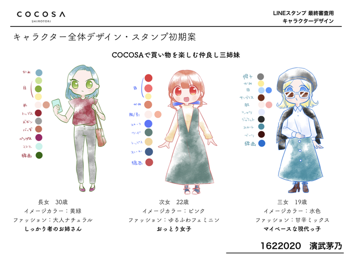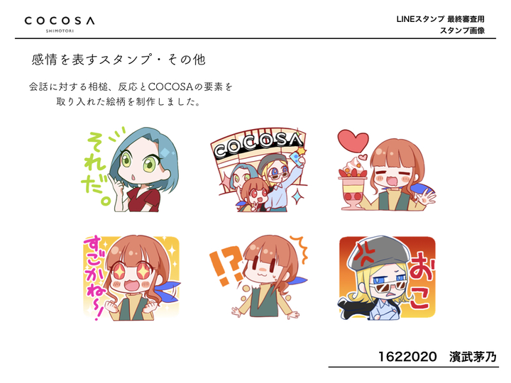 崇城大学×熊本の複合商業施設COCOSAさんとのコラボLINEスタンプが2月1日より販売開始されました。授業の一環をしてお仕事を受け、生徒と卒業生のイラストレーター・デザイナーさんを含めたそれぞれが12個のスタンプデザインを考えました。 11月10日から20日間、3つに絞られた候補への一般投票が行われ、グランプリとなりました。 画像には最終的にCOCOSAさんへのプレゼンとして使われた資料をそのまま載せています。 https://cocosa.jp/linestamp_result/