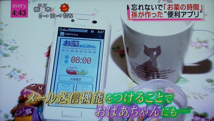 「お薬のじかん」は、高齢者の孤独死を防止すること、それに伴い離れて暮らす家族が高齢者の方の安否確認をできることを目指して作成し、株式会社D2C主催「アプリ甲子園2013」に出場したところ、第3位の成績を収めました。