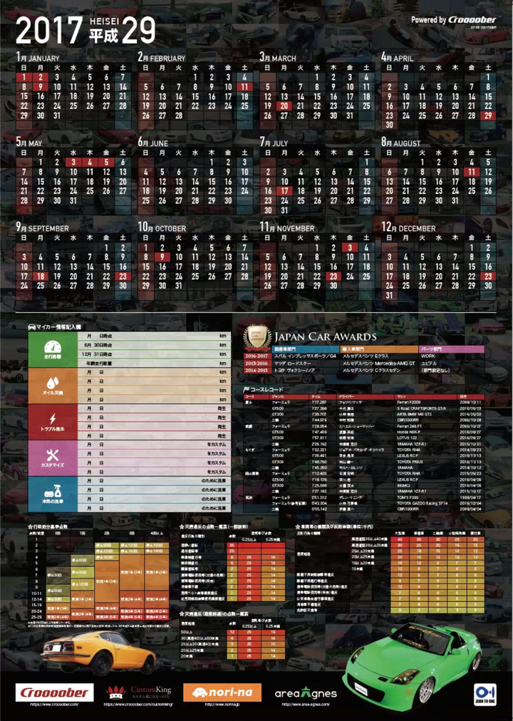 愛車の記録を書き込める欄や、違反・減点表など、内容充実のカレンダー。原案はアグネスさん。背景には一般公募でいただいたクルマの写真をタイル配置。データ容量が膨らんで大変でした・・・