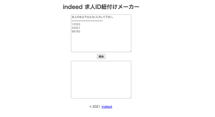 [Action] Indeedの求人IDの設定の仕様上、 ・一つずつ選択する必要がある 上記の課題があった。 これを解決するための一括登録ができるツールを作成。 ①splitでtextareaの内容を改行で分割して配列に格納 ②replaceで改行を「 OR 」に置換する [result] 一つずつの選択する手間が無くなり、設定が楽になった。 [Self-Appraisal] 他媒体の求人ID設定時にも仕組みを応用することができた。