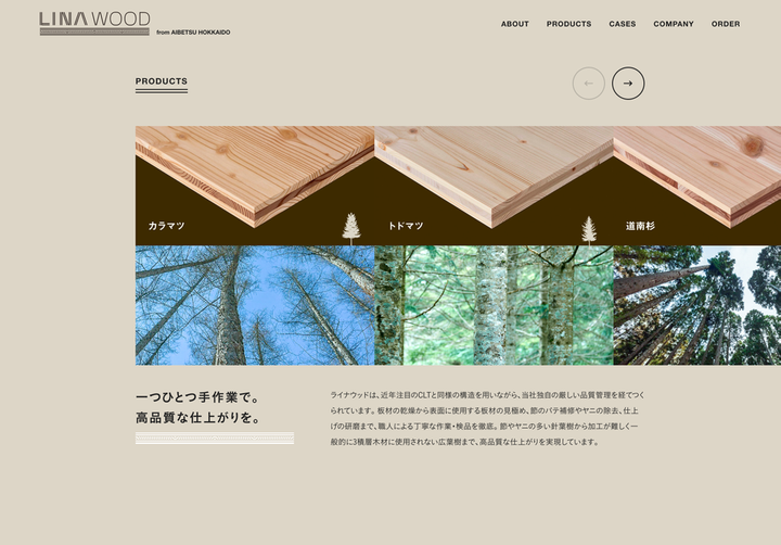 「LINA WOOD」は3枚の木の積層からなる「つよさ」と「うつくしさ」を兼ね揃えた木材で、地材地消にこだわり、環境への「やさしさ」にも配慮しています。ロゴをはじめ、3層のラインを生かしたデザインの展開をしています。