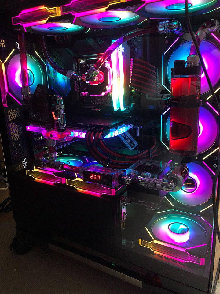 グラボまで本格水冷のくせに積んでるのは3070という見かけ倒し。 ポンプの架台が難産ポイント。 →ホムセンのサポ材を組み合わせて16ファン用のネジ穴で固定。