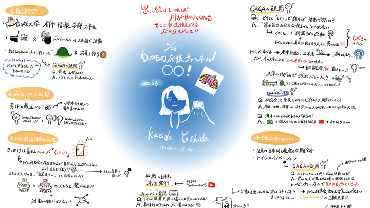 わかものたちへ元気や勇気…生きるパワーを届けるためのZoom×YouTubeオンライン番組であるわかもの応援チャンネル〇〇!さんにて第23回のゲストとして呼ばれたKaede Yoshidaさんのグラレコになります。
