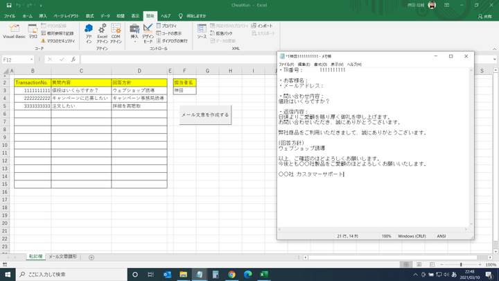 コールセンター業務の一環としてお客様からの問い合わせメールへの返信業務をすることになりました。その業務は書類のコピペ作業が多く工数に無駄が多かったため必要な項目を入力欄にコピペしてボタンをクリックするだけでを瞬時に書類を生成するツール「チート君」を開発しました。ExcelVBAを使用しています。 ExcelVBAを選択した理由としてはセキュリティの堅固なコールセンター内で開発できるツールがExcelVBAのみであり、メール返信業務には元からExcelを使った作業が多かったため使用する技術として最適だと判断したからです。 「チート君」によって60%以上の工数が削減されました。そしてストレスは90%以上削減されました。