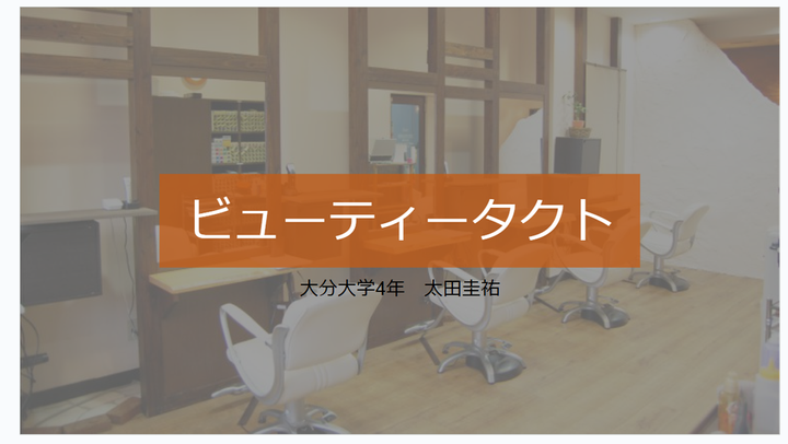大分大学4年生のとき、大分大学主催のビジネスコンテストで優勝を頂きました。内容は美容師の作業効率化のIoTの案です。実際に美容室までヒアリングに出向きプレゼン資料を作成しました。