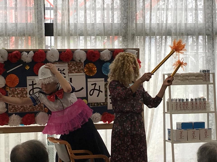 定期的にレクリエーションの時間にお楽しみ会を開催して、ビンゴで景品配りをしたり、身体を張ってお客様を楽しませたりなどしました。お客様、スタッフともに皆が笑顔になる時間なのでとても思い出深いです。 (この日は女装をしてビンゴ大会を開催しました)