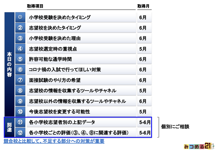 これまで活用されていなかった模試のデータと新たに設計した保護者様へのアンケートを利用し、私立小学校のコンサルティングサービスを開始しました。2021年6月に実施したセミナーには私立小学校27校にご参加いただきました。