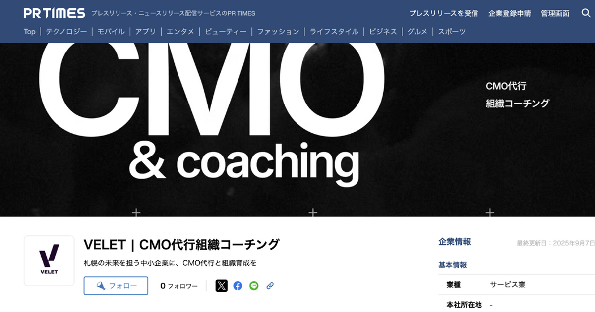 2025,6〜CMO代行、マーケティングコンサルティングサービス業をスタート 2025,8〜veletに改名 2025,9〜組織コーチングサイトスタート
