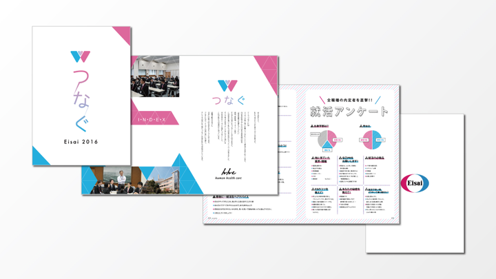 エーザイ株式会社様の、2017年度新卒採用者向けのパンフレットを作成。計28ページのデザインを担当した。